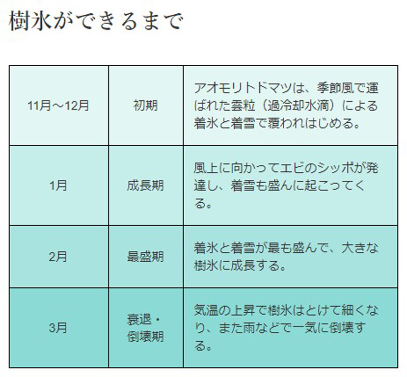 樹冰來說分成四大時期(初期、成長期、最盛期、衰退期),最好觀賞的時間會落在2月前往,樹冰出現的狀況是(著冰:雪覆蓋在枝葉,著雪:因為很多雪覆蓋在樹上,燒結:冰變硬後或雪會在附著而重複)