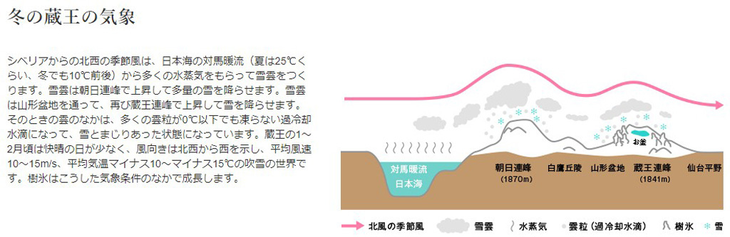 冬天藏王部分氣象,除來自西伯利亞的西北季風外,日本海的對馬暖流的水蒸氣會形成雪雲,雪雲連續上升後就會累積很多雪,雪雲透過山形盆地後再從藏王連峰上升化成雪之後再下降,而藏王在1月~2月時並沒有很大的太陽,平均溫度落在-10~-15度的風雪世界,這也是適合樹冰成長的要素。