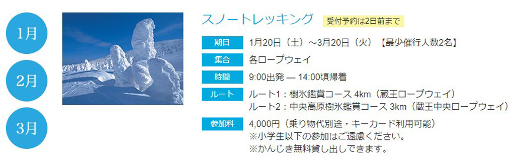 主要觀賞期會落在1月~3月除觀賞外,也可參加樹冰的健行,直接和樹冰作接觸。