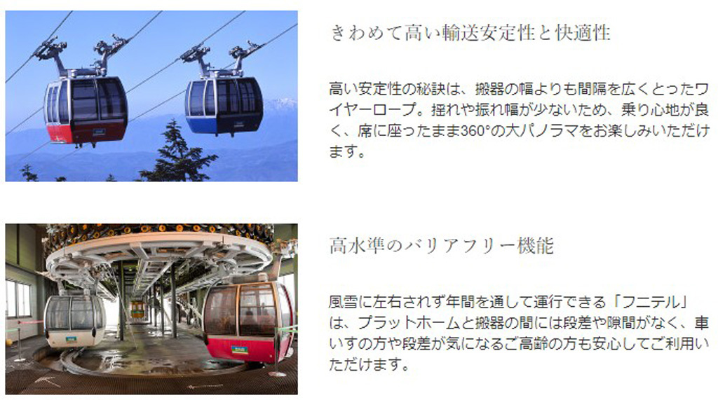 在山頂線可以看到複式單線自動循環纜車,就算在山區也可以暢行,大多是使用在滑雪場上運送人員和裝備,就算風很大搖晃程度也不會太強,算是很安全的纜車。