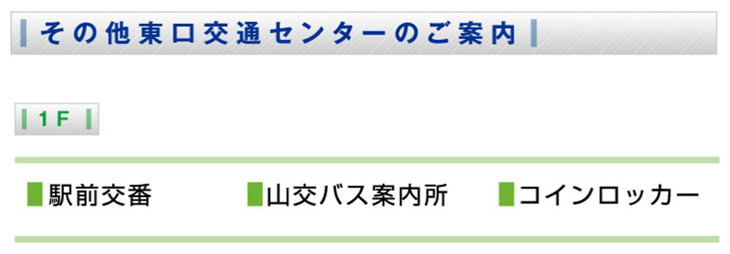 東口有山交巴士案內所和置物櫃,記得走到山交巴士案內所之後再把行李放到置物櫃即可,沿途都只有小置物櫃很難找到大的也很浪費時間。