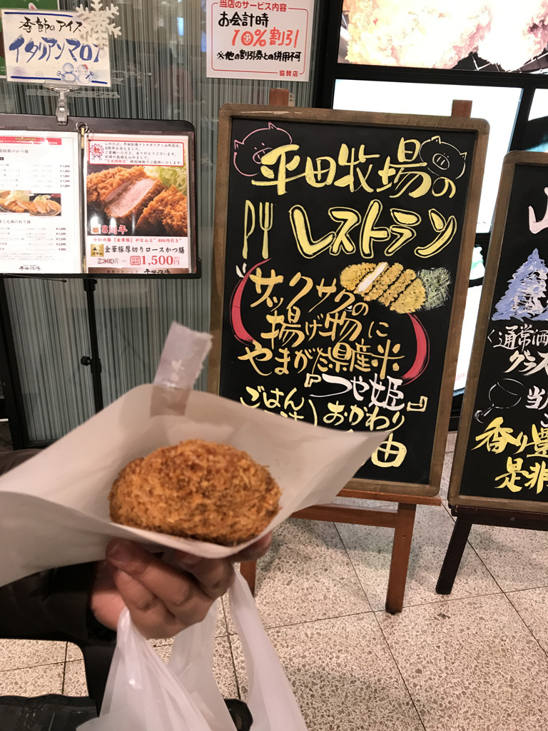 下到山形車站後,因為體溫流失太多,趕快買了品田牧場的可樂餅充饑。